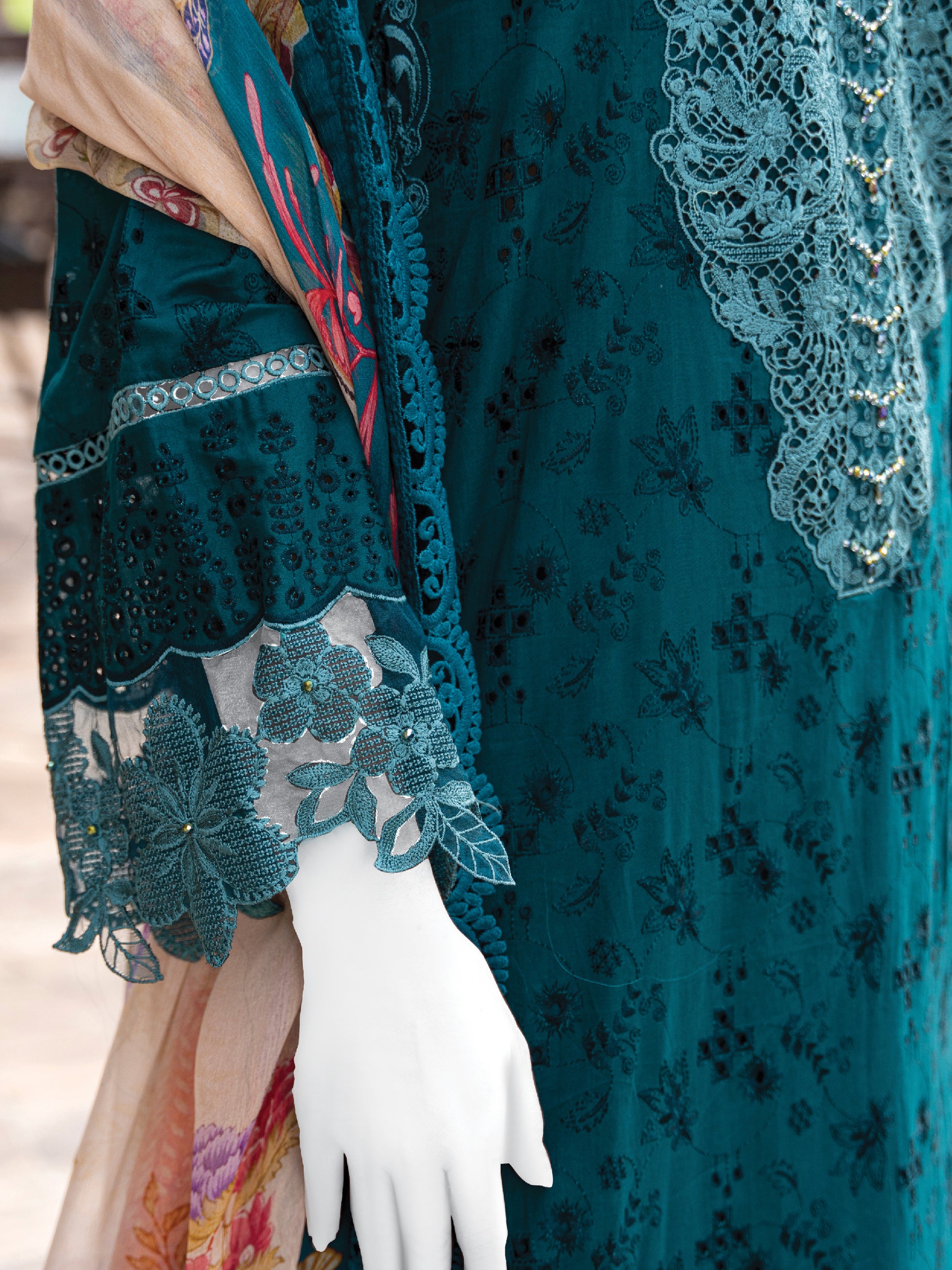Paired with an embroidered chiffon dupatta featuring a four-sided organza border and a dyed cambric trouser.